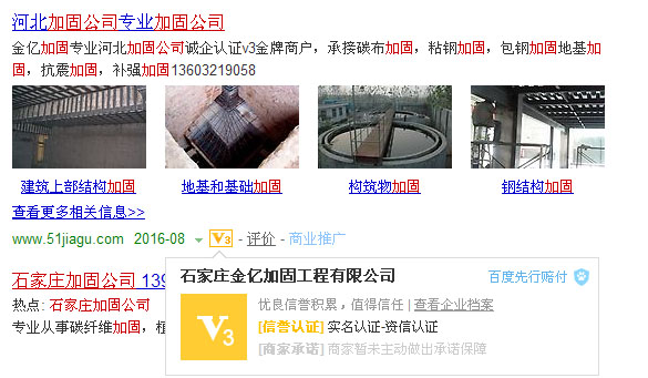 2016年6月,百度權威認證機構委派專員來公司考察,針對經營場所、資本及財務能力、生產及研發能力、運營能力、產品及品牌能力、信息系統管理能力、質量管理能力、售后服務能力等十八項進行核驗。正式通過百度誠企認證企業,被百度推薦為百度誠企專區金牌商戶,授予V3信譽等級,獲得了百度的認可與強勢推薦企業。百度這標志著金億加固公司在誠信檔案中又多了濃墨重彩的一筆,在建筑加固行業中一枝獨秀,繼續保持強勁的發展勢頭。